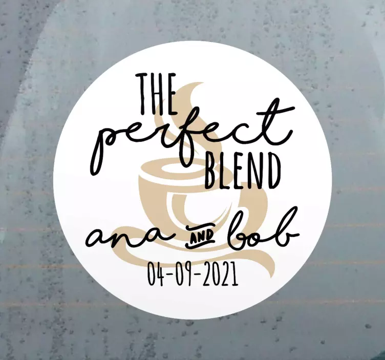 Dette design er inspireret af kaffe og har teksten 'den perfekte blanding' sammen med en kaffedrik. Det kan tilpasses med parrets navne og dato for begivenheden, så det passer perfekt til jeres bryllupstema.