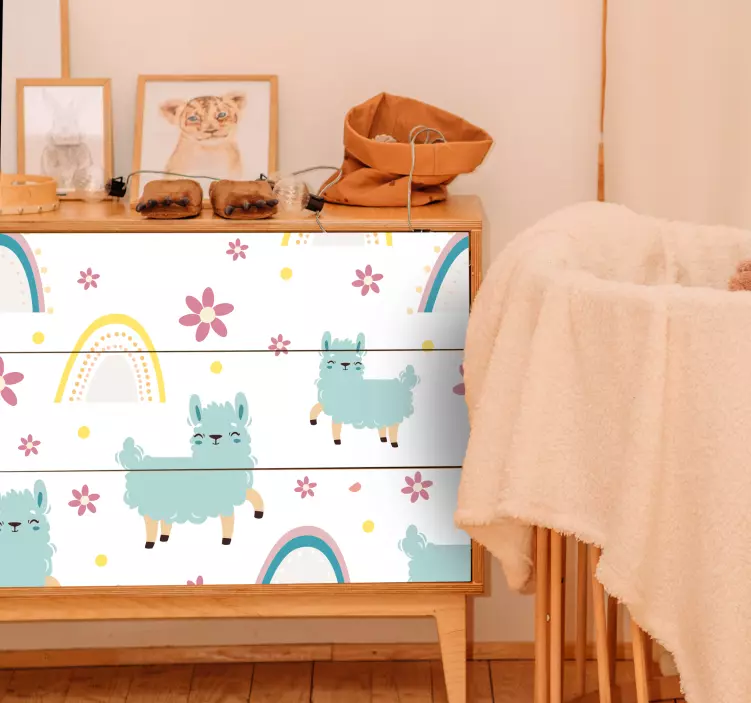 Oplev det Charming llama concept klistermærke, der bringer liv og farve ind i dit hjem! Dette grafiske design kombinerer legende lamaer, smukke blomster og farverige regnbuer i en fortryllende illustration. Mønstret er skabt til at pynte dine møbler og skabe en glad atmosfære i ethvert rum.