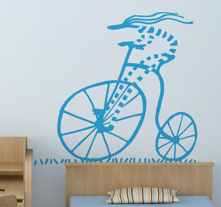 Vores cykelklistermærke dynamisk cykelillustration præsenterer en grafisk fremstilling af cykling, hvor en cyklist i bevægelse fanger essensen af sport og aktivitet. Den stiliserede tegning er designet til at inspirere og bringe liv til ethvert rum, samtidig med at den fremhæver den frihed og glæde, der følger med at cykle.