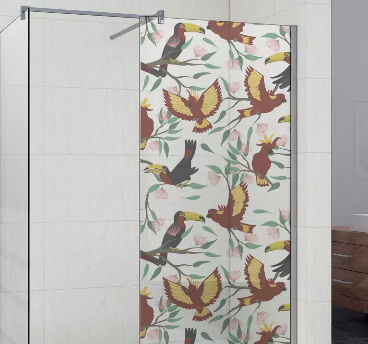 Er du træt af et kedeligt badeværelse? Så er dette farverige design med papegøjer og tukaner lige noget for dig! Du kan nemt dekorere dit brusebad på bare få minutter med dette klistermærke. Designet inkluderer flere fugle, træer og blade, der vil give dit badeværelse et tropisk og livligt udseende.