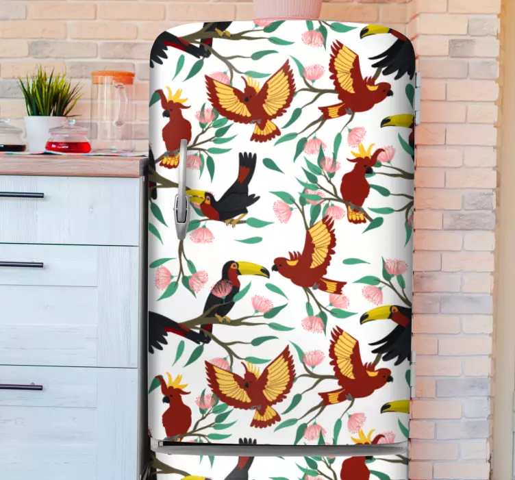 Oplev vores fantastiske fugle klistermærker med tropiske fuglemotiver, der bringer et strejf af naturens skønhed ind i dit hjem! Designet byder på farverige papegøjer og tukaner, der svæver blandt blomster og skaber et finurligt mønster. Disse livlige klistermærker er perfekte til at forvandle dit køleskab eller andre flade overflader til en tropisk oase!