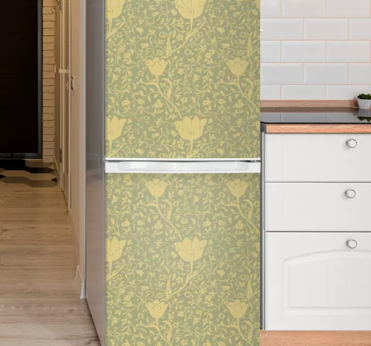 Dette køleskabsklistermærke er det perfekte valg til at dekorere din køleskabsdør. Det subtile blomstermønster i guld og grøn vil give dit køkken et elegant og sofistikeret udseende.