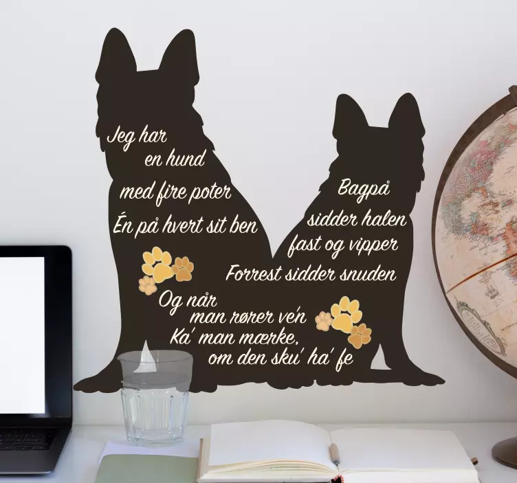 Med dette vægmærke kan du vise din kærlighed til din firbenede ven. Det er let at placere på overfladen ved hjælp af en spatel, og det vil ikke krølle eller skabe bobleeffekt. Det kan også let fjernes, hvis du ønsker at ændre placeringen.