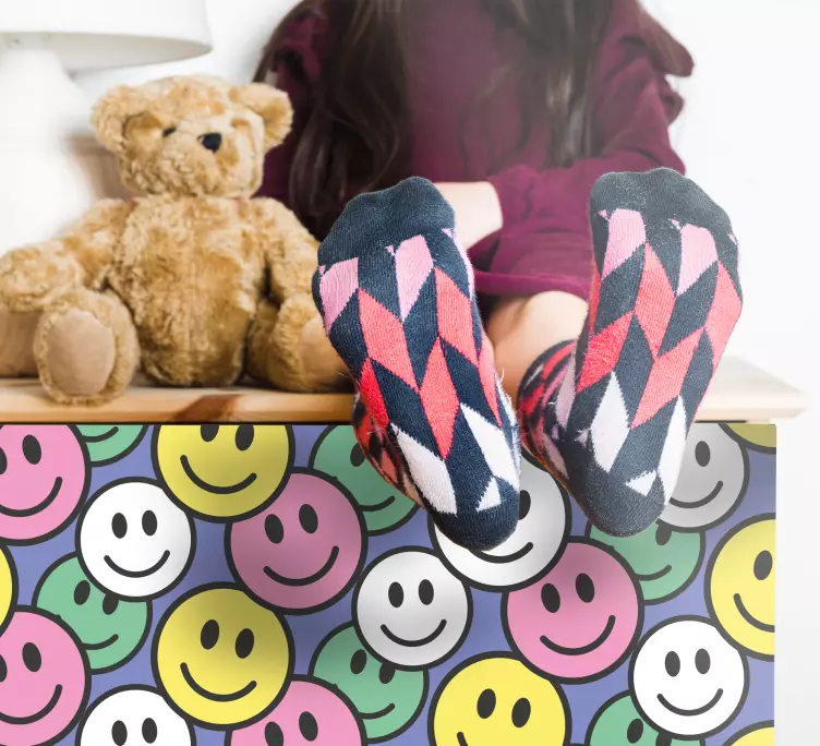 Reference: A49043En munter komposition med smiley-ansigtter arrangeret i et livligt mønster, der skaber en atmosfære af glæde og positivitet. Blandingen af lyse farver forstærker den legende karakter af dette design, hvilket gør det ideelt til et børnevenligt miljø.