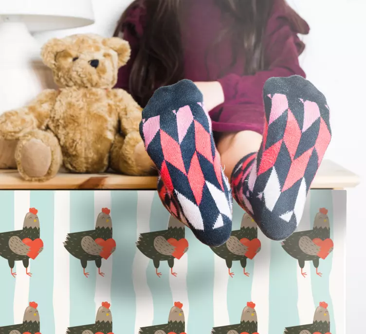 Oplev vores Klistermærke dyr med charmerende kyllingemønster, der bringer liv og farver til dit hjem! Dette grafiske design, der inkluderer en sød kylling, haner, hjerter og striber, skaber et unikt mønster, som vil dekorere dine møbler og give din gård en hyggelig atmosfære. De farverige detaljer gør det til et perfekt valg for enhver dyreven.
