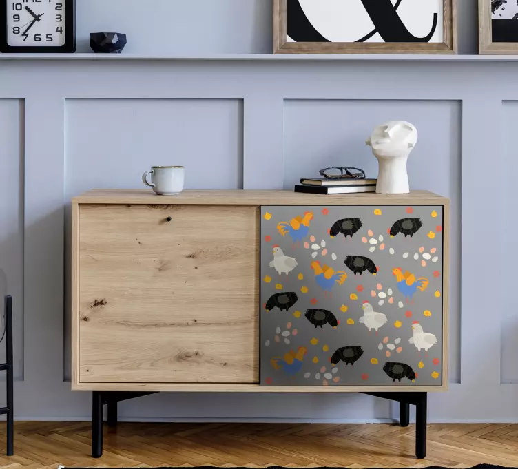 Reference: A52348En livlig komposition med forskellige husdyr, herunder farverige kyllinger og sorte høns, spredt over en lys baggrund. Dette legende design skaber en munter atmosfære, perfekt til at tilføje charme til ethvert rum.