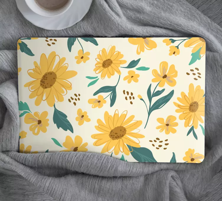Oplev vores fantastiske klistermærke til bærbar med muntert blomsterdesign, der bringer liv og farve til din hverdag! Dette grafiske design, der prydes af solsikker og farverige blomster, fanger essensen af natur og skaber et livligt udtryk på din bærbare computer. Den blomstret illustration i gul nuancer vil helt sikkert lyse op i dit arbejdsmiljø og bringe smil på læben!