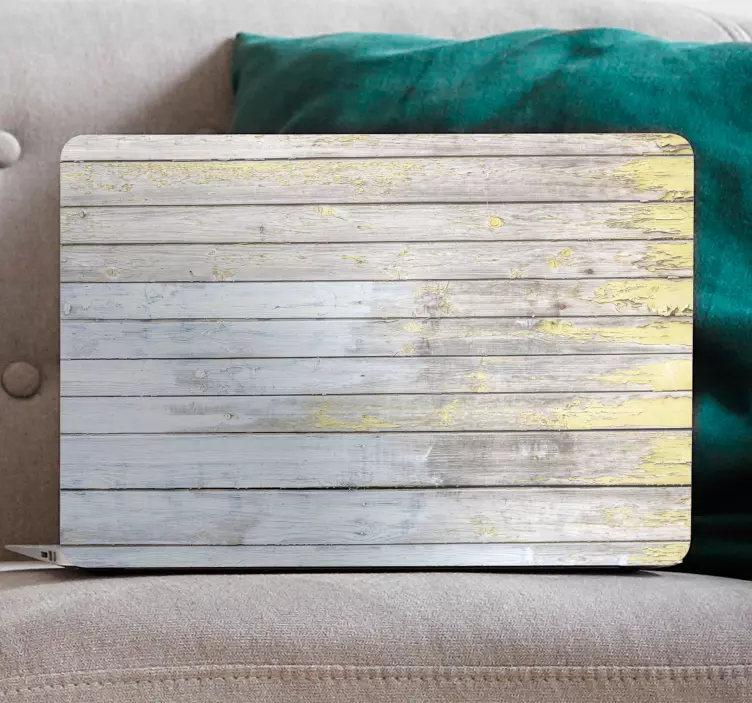 Oplev det unikke klistermærke til bærbar med rustik træfinish, der tilføjer et grafisk touch til din bærbare computer! Dette design fremhæver en smuk struktur af træ, der minder om forvitrede planker med en varm gul og hvid farvekombination. Det rustikke udtryk gør det til et perfekt valg for dem, der ønsker at give deres enhed et personligt præg.