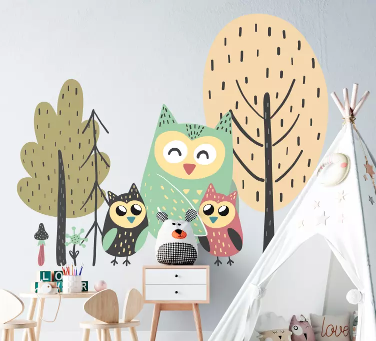 Reference: A48460En glad illustration af en uglefamilie omgivet af stiliserede træer og planter. Designet udstråler varme og venlighed, perfekt til et børneværelse, der fremmer kærligheden til natur og dyr. De legende elementer forbedrer atmosfæren og skaber et glædeligt og indbydende rum.