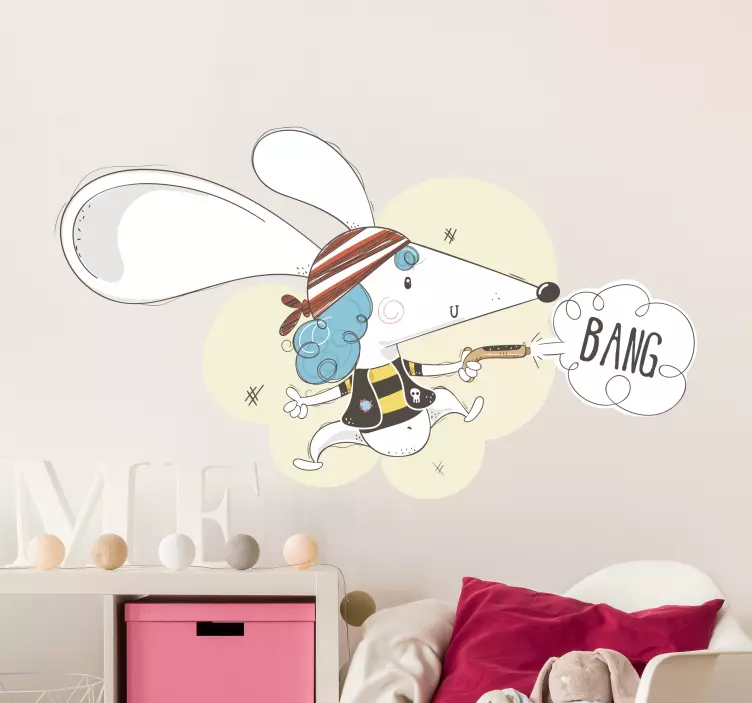 Reference: A47215En legesyg tegneserieafbildning af en mus klædt som pirat, komplet med en stribet hat og blåt hår. Den fantasifulde karakter holder et legetøj og udbryder 'BANG', hvilket tilføjer en følelse af sjov og eventyr, perfekt til børns rum.