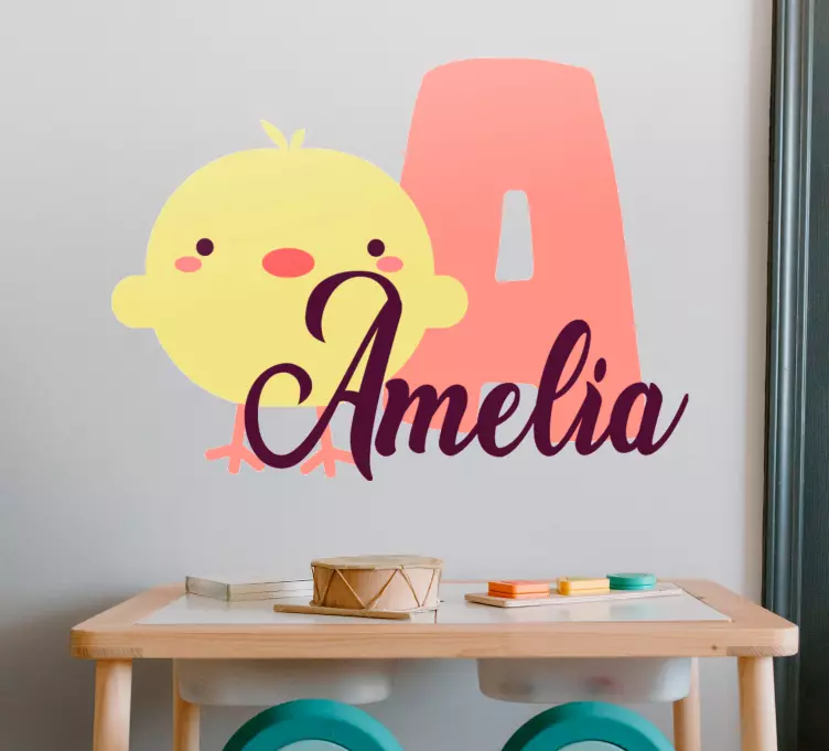 Reference: A48924Et charmerende kyllingedesign præsenterer en venlig gul kylling sammen med en farverig initial og et tilpasseligt navn. Dette legende element er perfekt til at skabe en dejlig atmosfære i et barns rum, hvilket tilføjer varme og individualitet til deres værelse.