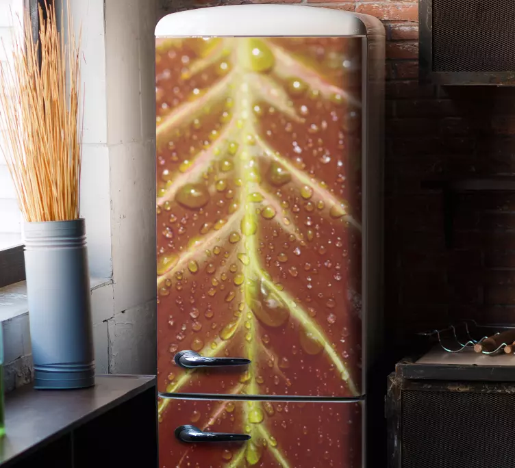 Oplev det smukke køleskab klistermærke blad vanddråber, der bringer naturens skønhed ind i dit hjem. Dette grafisk designede klistermærke er inspireret af maranta-plantens bløde, grønne blade og de fine vanddråber, der ser ud som om de lige er faldet fra himlen. Med sin blomstrede struktur og livlige farver vil det straks forvandle dit køleskab til et kunstværk, der udstråler friskhed og liv.