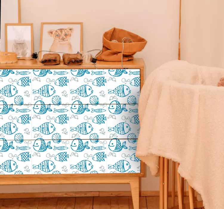 Oplev magien ved vores Køleskab klistermærke med finurlige fiskemotiver, der bringer livet fra havet ind i dit hjem! Dette grafiske design er ikke blot et klistermærke, men en farverig dekoration, der vækker glæde i børneværelset. De finurlige fiskemotiver, som svømmer blandt bobler og skaller, skaber en sjov og livlig atmosfære, hvor drømme om det undersøiske liv kan blomstre. Klistermærkets mønster er perfekt til at udsmykke møbler og tilføje et strejf af havets skønhed til ethvert rum.