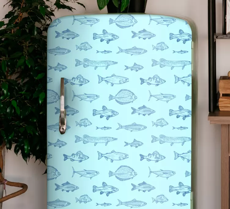 Oplev skønheden i havet med vores Køleskab klistermærke med vandmønster design. Dette unikke design fanger essensen af det marine liv med farverige illustrationer af fisk, bølger og oceanets dybder. Hver tegning er omhyggeligt udformet for at bringe et strejf af havets charme ind i dit hjem. Med dets bløde blå nuancer og detaljerede mønstre skaber det en visuel fest, der vil forvandle dit køleskab til et kunstværk, der inspirerer og glæder.