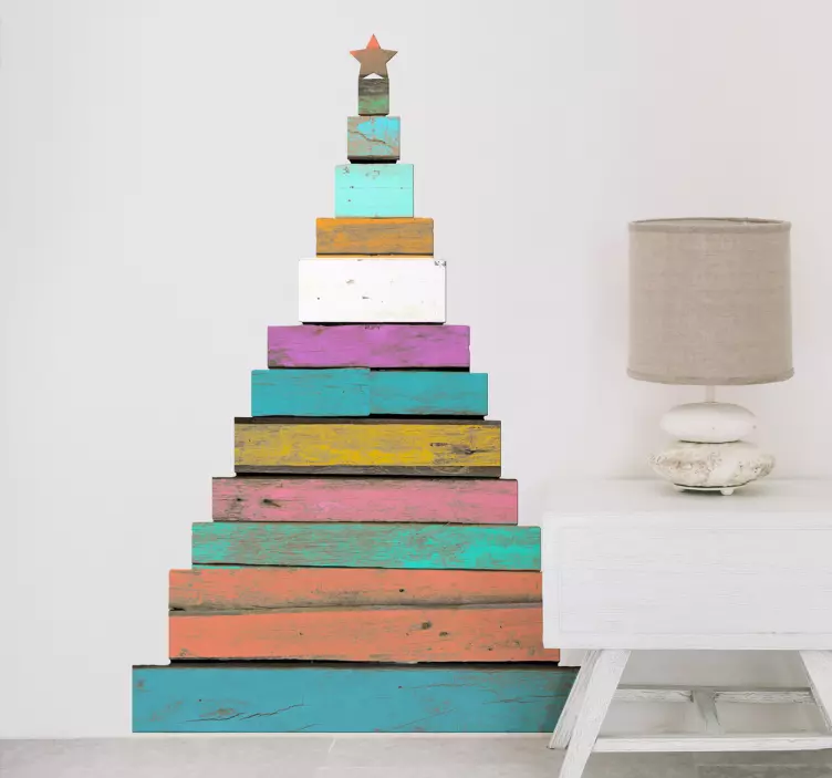 Kreativ juletræ sticker lavet af træbokse. Denne alternative juledekoration vil med sikkerhed skabe opmærksomhed over julemaden, og være en anden måde at pyte op til jul på. Klistermærket kan købes i mange forskellige størrelser og er produceret af kvalitets vinyl som sikre holdbarhed.