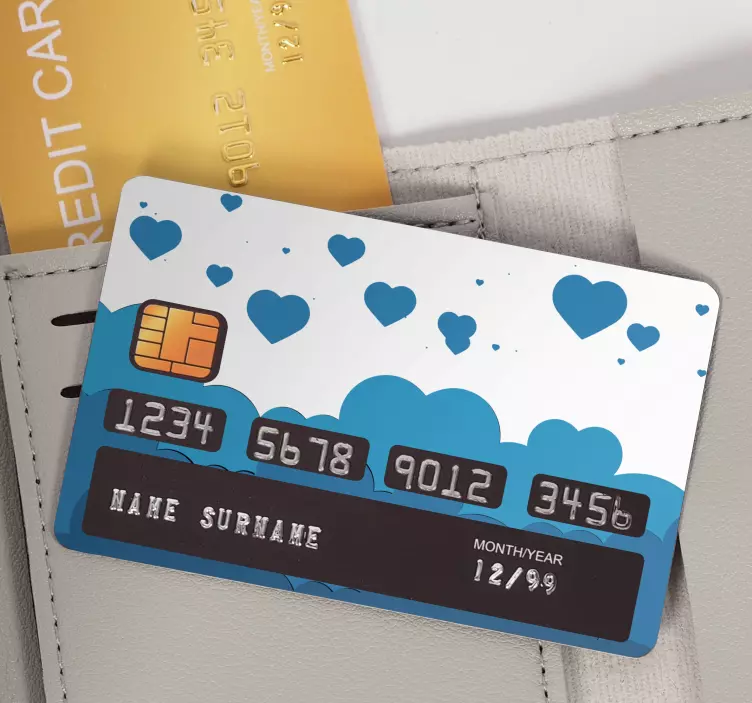 Dette kreditkort klistermærke med sky hjerter mønster kombinerer legende grafiske elementer med en romantisk charme. Med et design præget af hjerter og skyer i smukke blå nuancer, bringer dette klistermærke et strejf af kærlighed og glæde til dit kreditkort. Det er den perfekte måde at udtrykke din personlighed og gøre dine betalingsmetoder mere unikke!