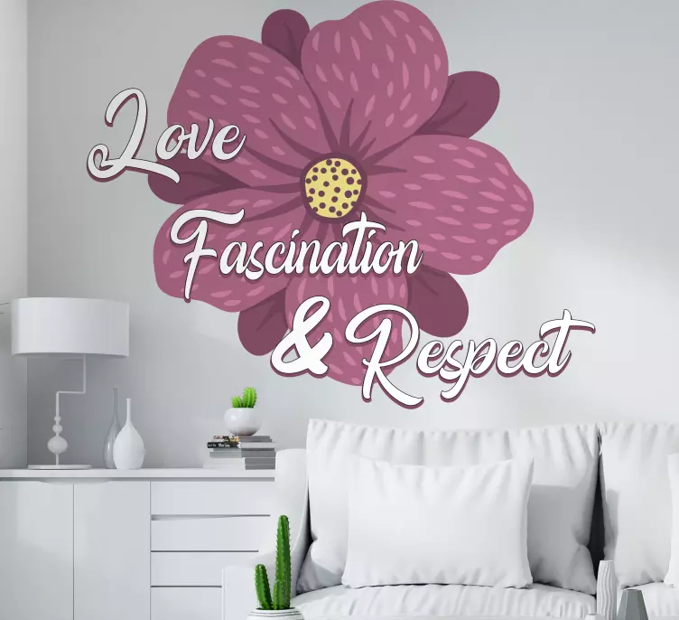 Reference: A48132Dette design præsenterer en smuk blomst sammen med en hjertelig besked, der understreger kærlighed, fascination og respekt. Den fede typografi og de blomsteragtige elementer skaber en varm atmosfære, hvilket gør det perfekt til at forbedre personlige rum med positive affirmationer.