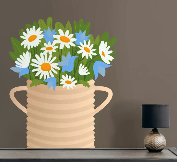 Oplev vores fantastiske Wallsticker dyr blomsterarrangement vase, som bringer livet i naturen ind i dit hjem med et grafisk design, der fanger øjet. Denne smukke wallsticker indeholder en elegant vase fyldt med farverige blomster, tusindfryd med blå kronblade og grønne blade, der tilsammen skaber en harmonisk atmosfære. Det er den perfekte dekoration for dem, der ønsker at tilføje et strejf af natur til deres indretning!