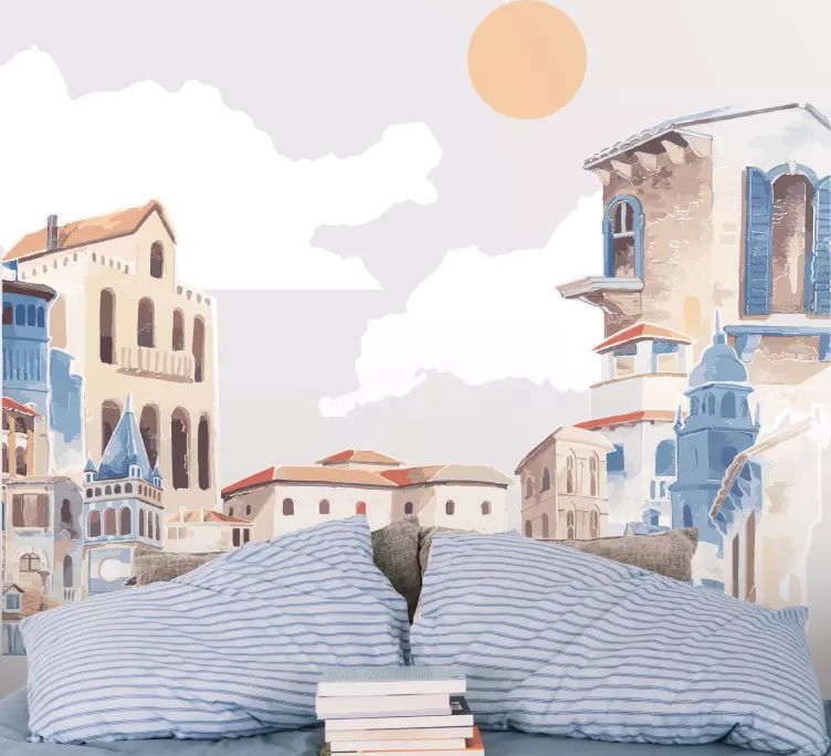 Oplev det charmende bylandskab med vores Wallsticker dyr, hvor grafisk design møder skønhed. Dette fantastiske produkt indeholder en fortryllende skildring af en by og en landsby med smukke bygninger og et maleri i akvarelstil. De varme toner, der omfavner solens lys, fremhæver den unikke arkitektur og det betagende bybillede, der vil berige dit hjem med liv og farve. Det er en perfekt kombination af blå nuancer og varme toner, der skaber en indbydende atmosfære!