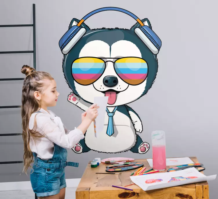 Oplev den fantastiske Wallsticker dyr cool kæledyr karakter, hvor grafikken bringer liv og glæde til dit hjem! Designet præsenterer en hund iført solbriller og hovedtelefoner, der stråler af sjov og leg med sit tegneserie udseende. Denne søde og farverige vægdekoration vil uden tvivl tilføje et musikalsk og livligt præg til ethvert rum, og den er perfekt til både børn og voksne!