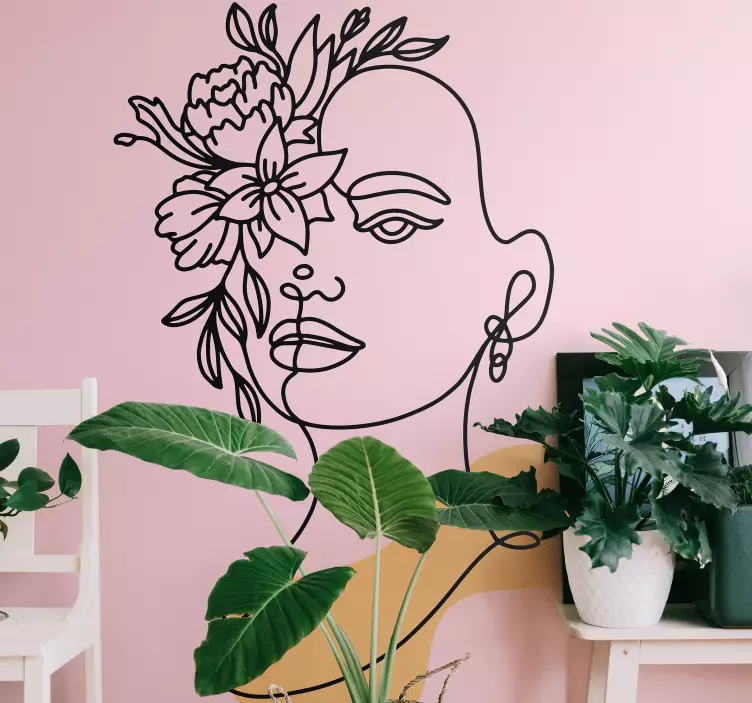 Reference: A51291En fængslende skildring med en minimalistisk stregtegning af en kvindes ansigt prydet med forskellige blomster. Denne komposition blander femininitet og natur og skaber et harmonisk fokus på skønhed og elegance, perfekt til at forbedre ethvert boligrum med et strejf af kunstneriskhed.