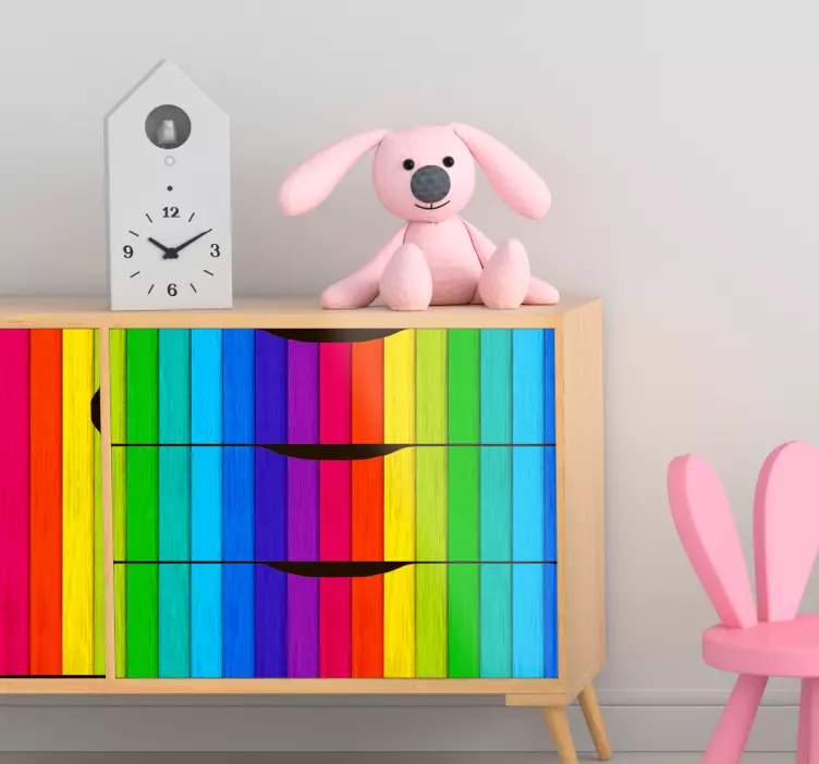 Oplev en verden af farver med vores Wallsticker dyr i livlige lodrette linjer. Dette grafiske design kombinerer en træ-effekt med planker og skaber et livligt mønster af regnbue farver, der vil forvandle ethvert rum. De flerfarvede striber giver et levende og abstrakt udtryk, der vil fange øjet og bringe glæde til dit hjem.
