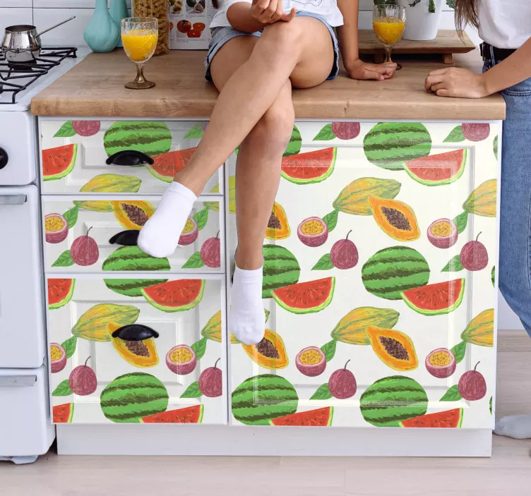 Reference: A51355En livlig sammensætning af forskellige frugter, herunder watermelon, papaya og passionsfrugt, skaber en indbydende og glad æstetik. Denne livlige fremstilling forbedrer atmosfæren i ethvert køkken og gør det til et dejligt friskt tilskud til hjemmets indretning.